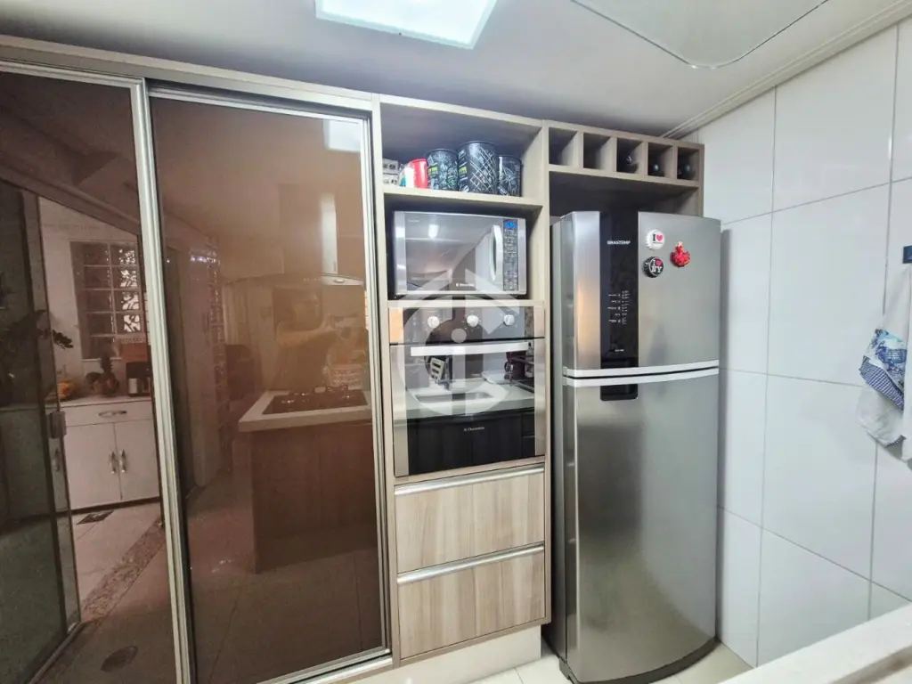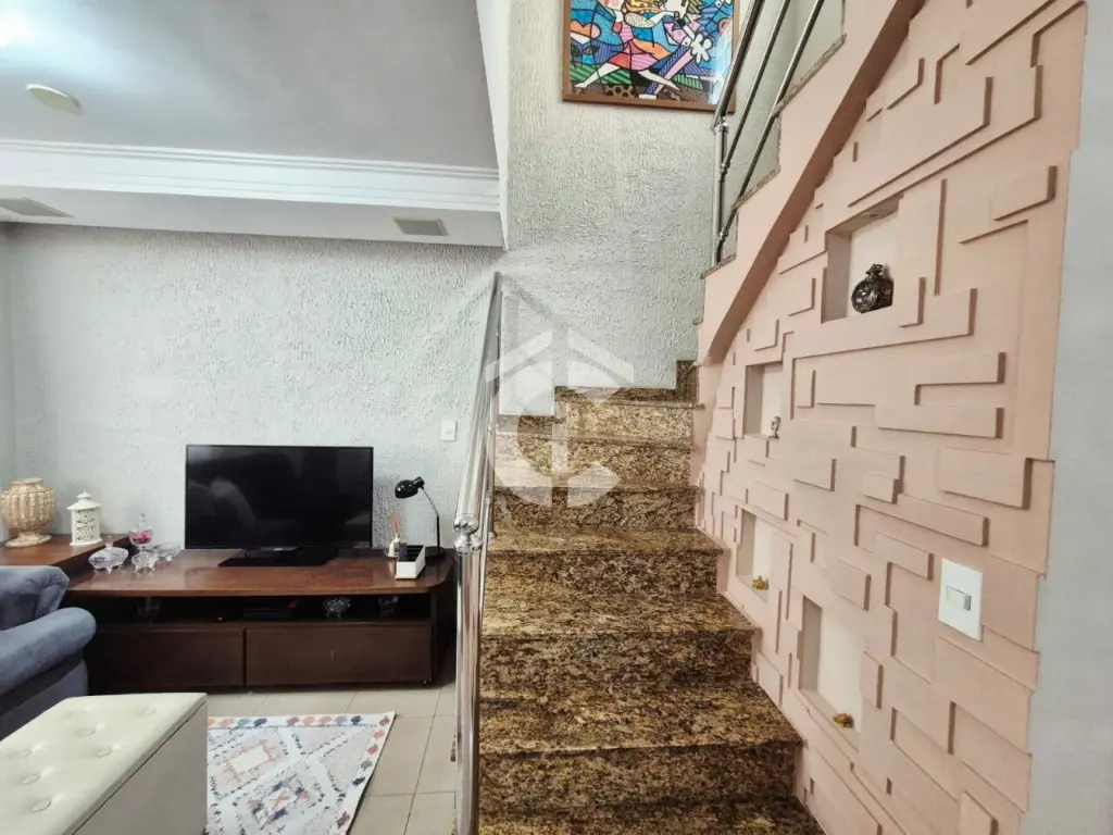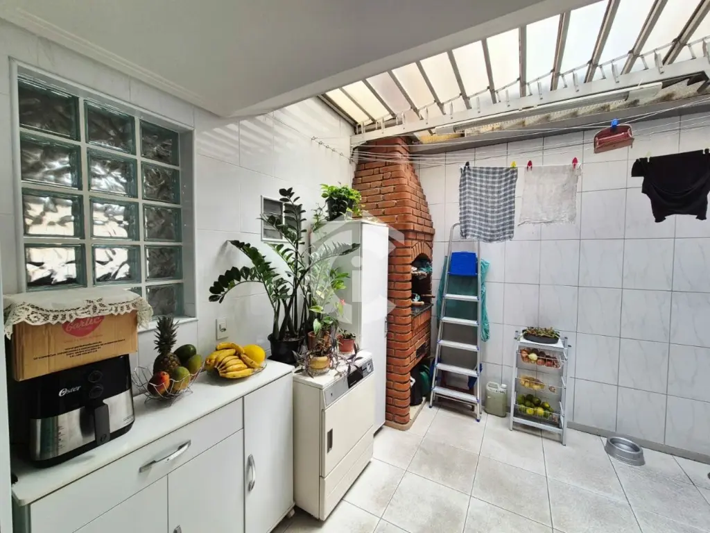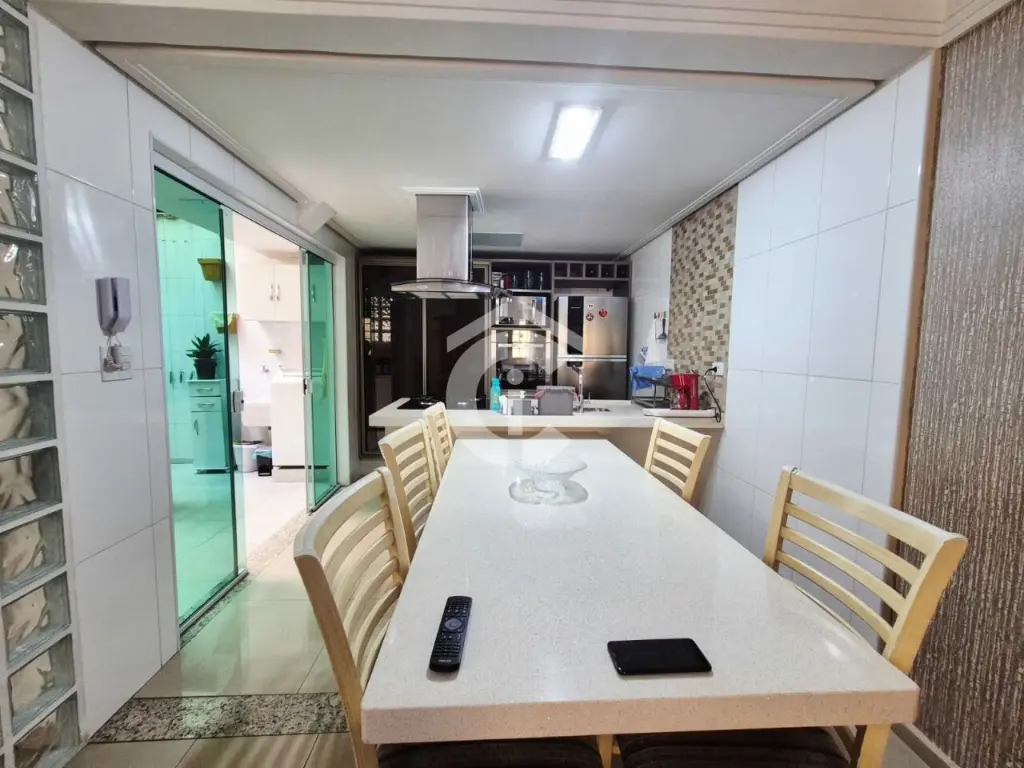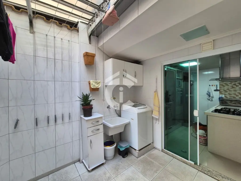 O imóvel é composto por sala para dois ambientes, lavabo, cozinha americana, lavanderia/quintal com churrasqueira, armários e Zetaflex, duas suítes, um quarto (de vestir), varanda e garagem coberta com três vagas.