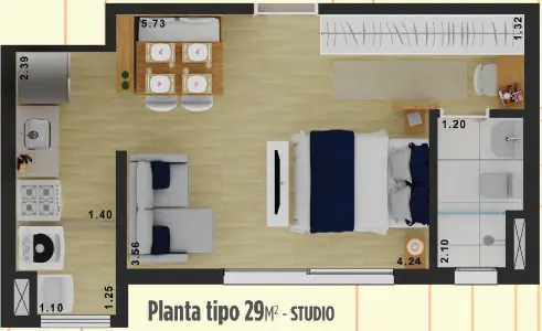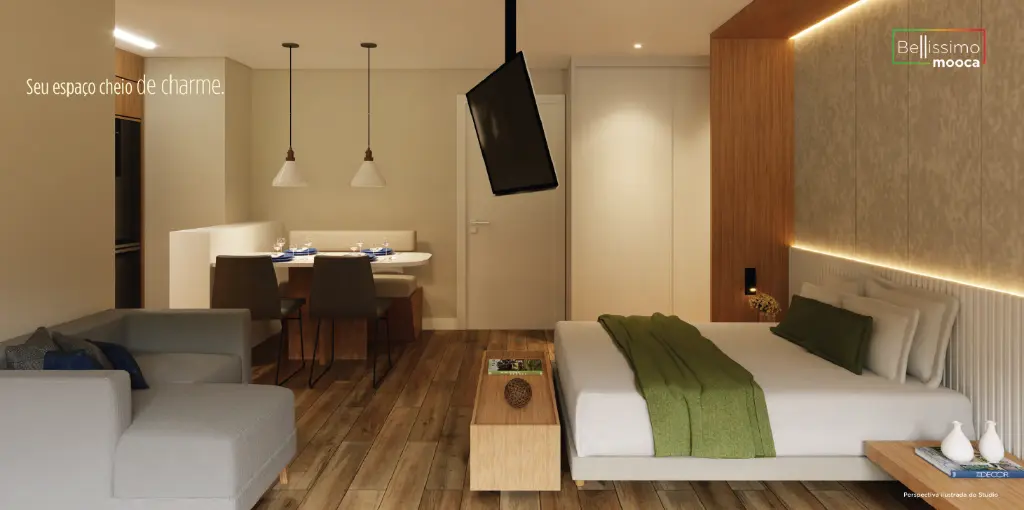 O imóvel no bairro Mooca tem 29 metros quadrados com 1 quarto e 1 banheiro