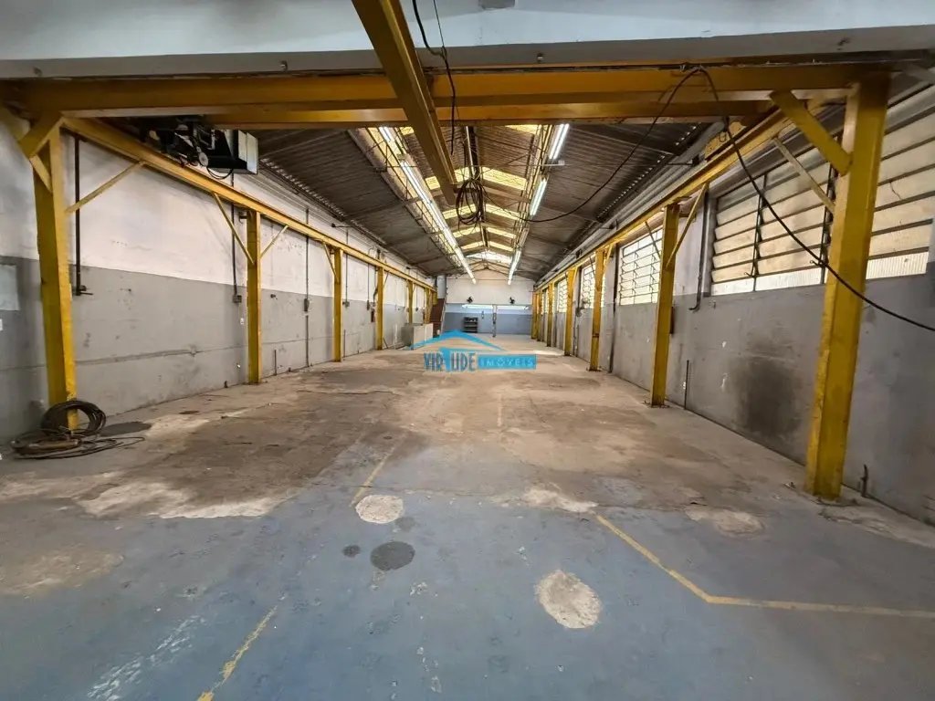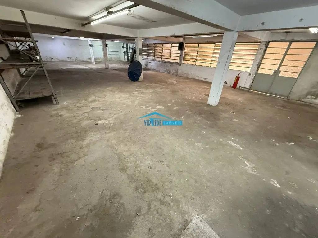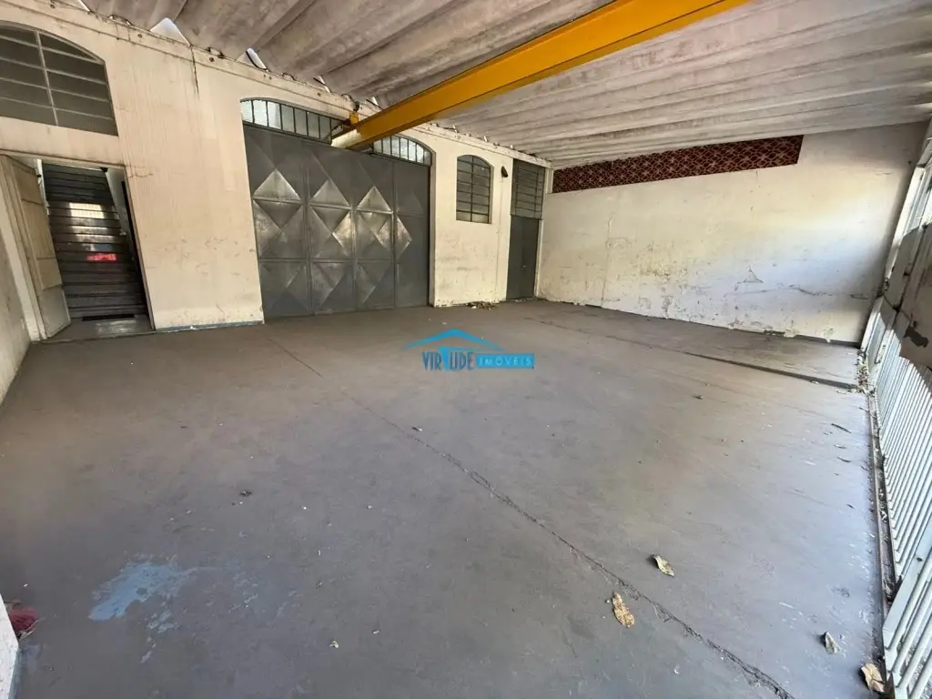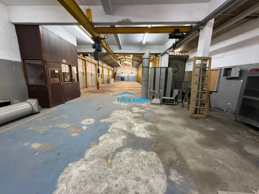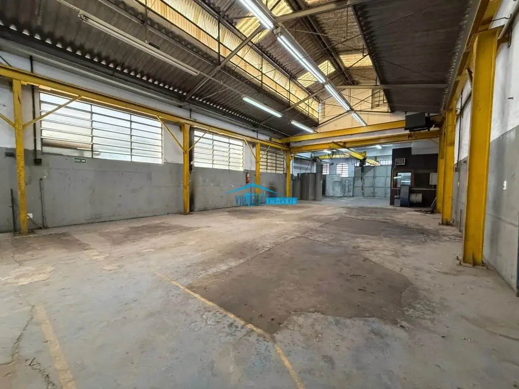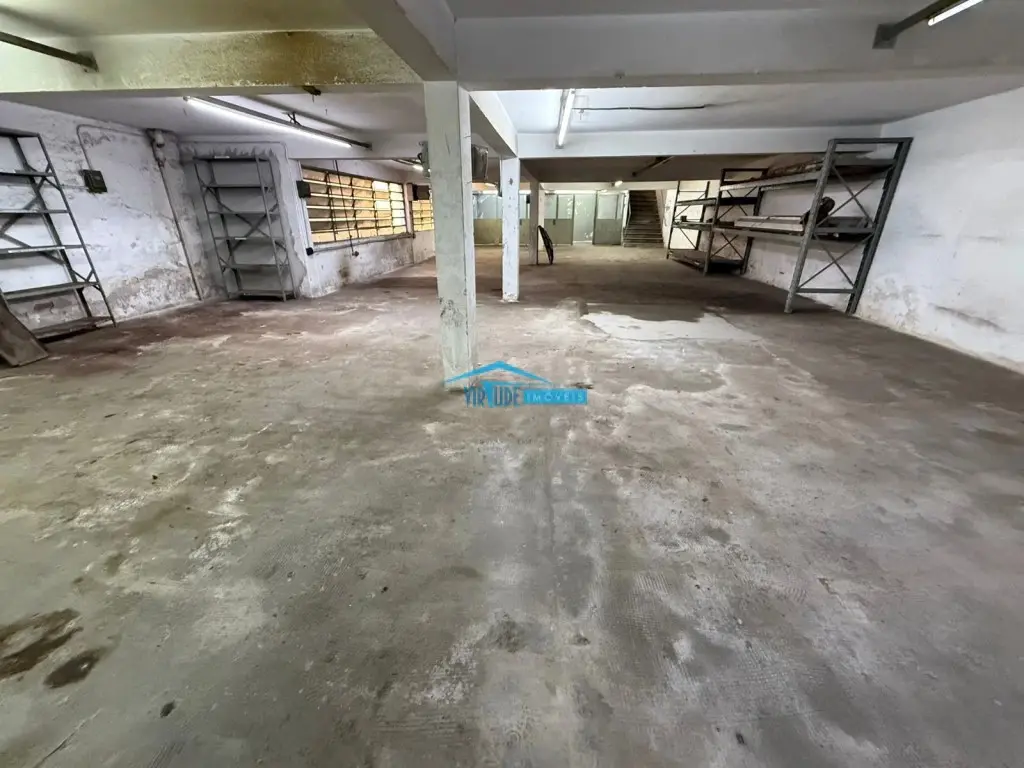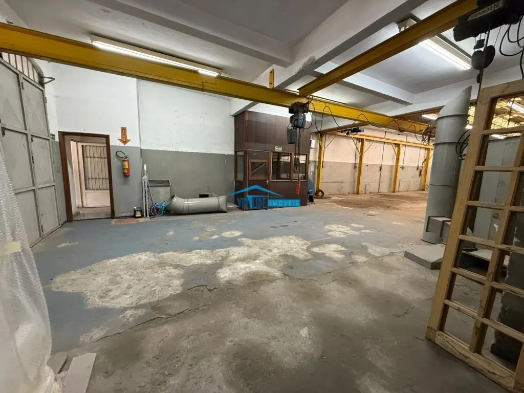 Salão com 930m², Piso Térreo com vão livre, ponte rolante, Piso superior com escritório, 4 salas e refeitório para funcionário e subsolo.