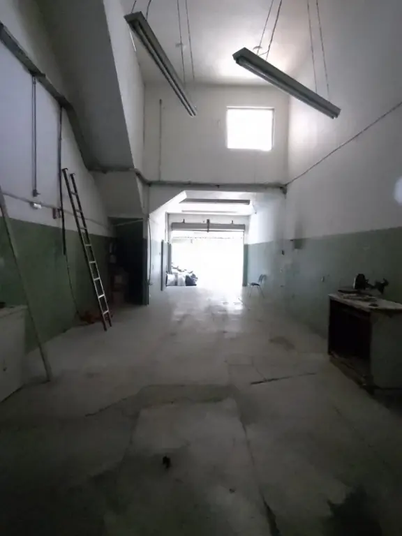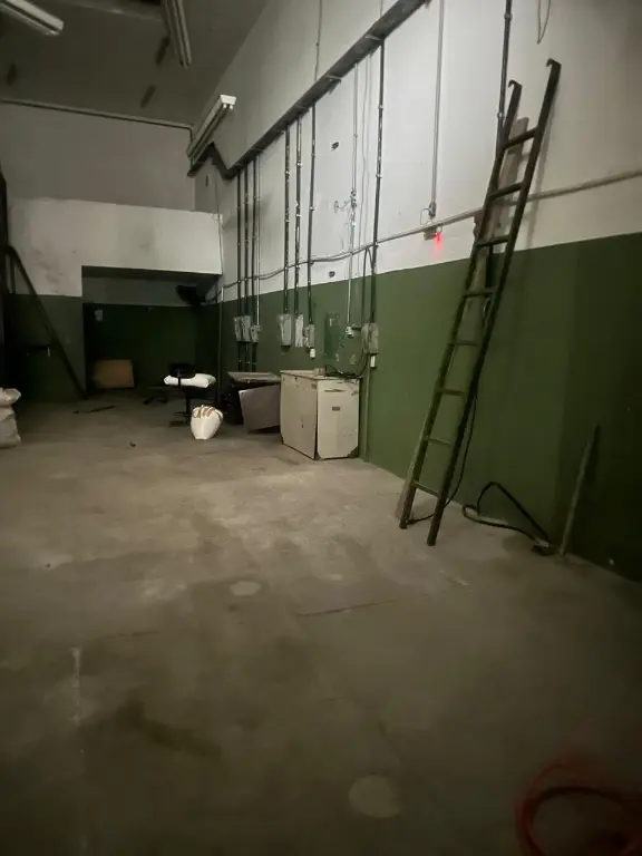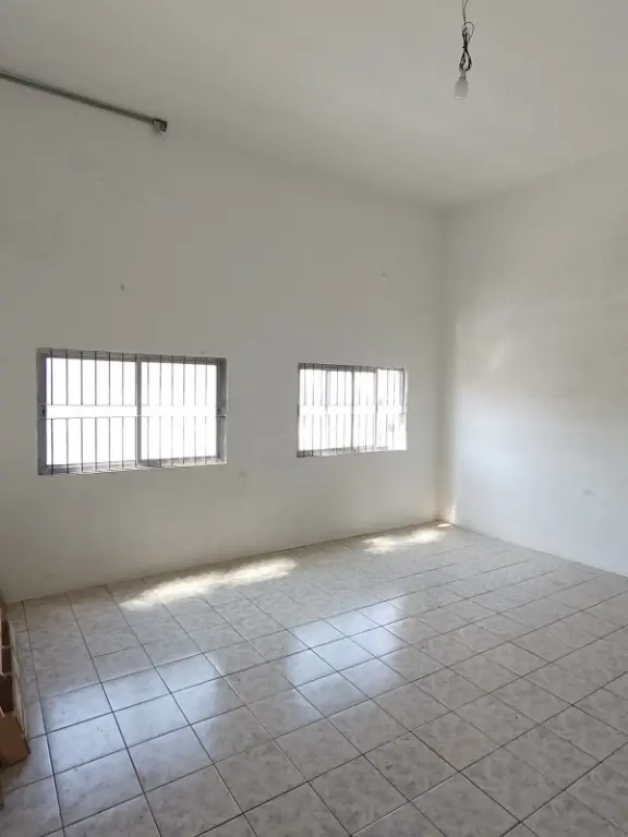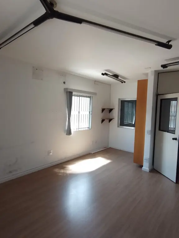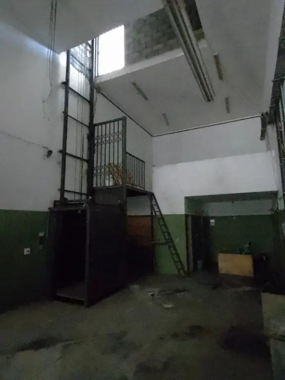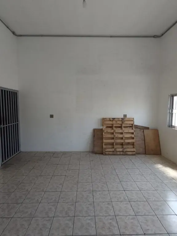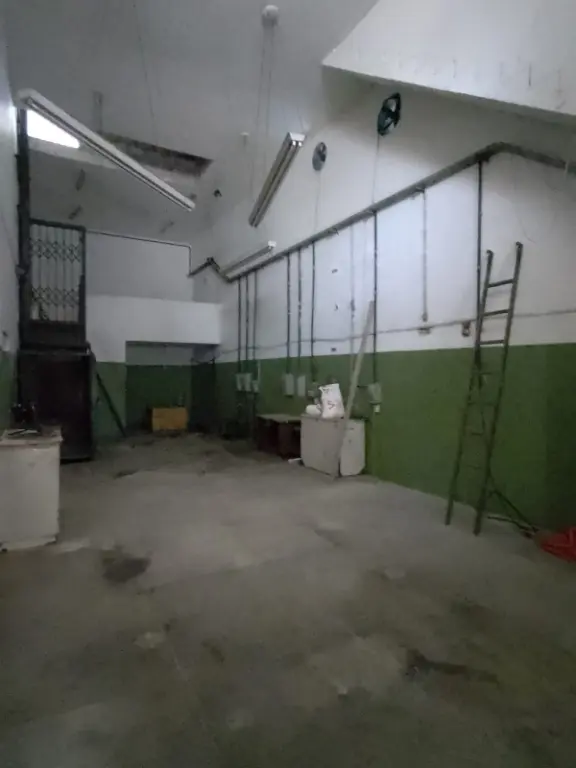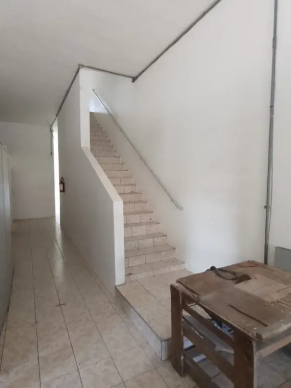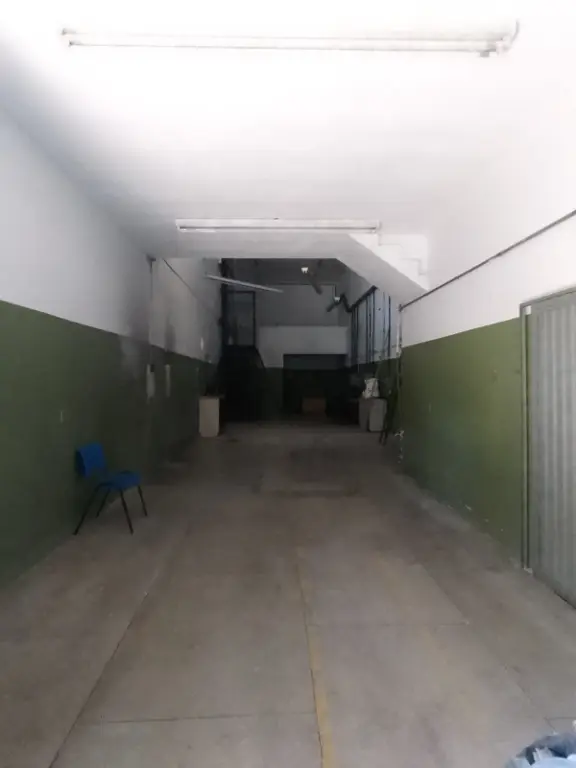 Piso térreo com portas de aço elétricas, vaga para automóvel, salão amplo, corredor lateral, mezanino para carga/estoque, 2 banheiros e elevador de carga para 500kg.