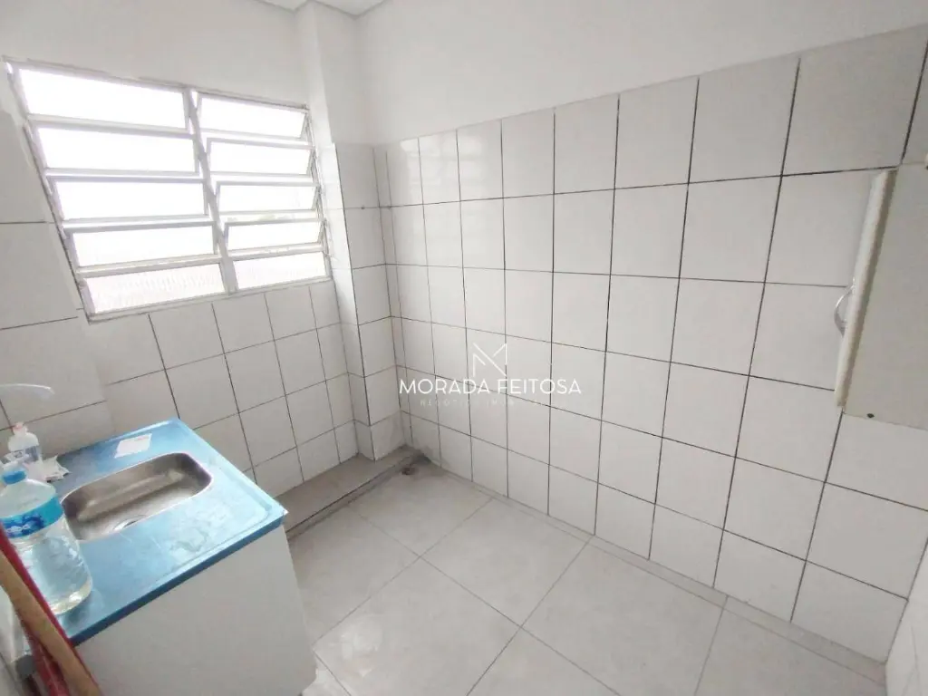 Sala medindo 15m, 3,40 x 4,32 com sacada, bem iluminada, recepção, banheiro e cozinha são comunitários entre as salas.