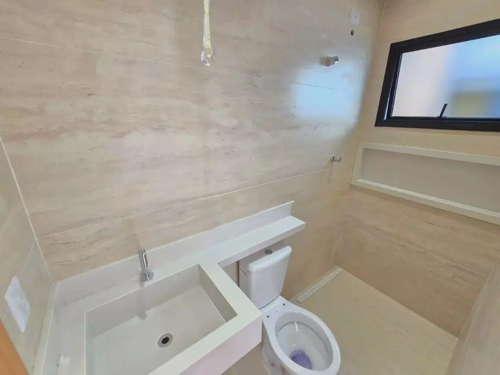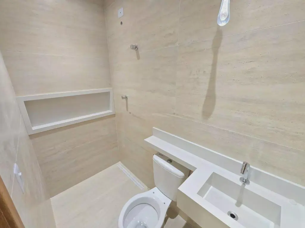 O acabamento foi cuidadosamente selecionado, com porcelanato Delta, portas e batentes Madeisa e esquadrias em alumínio da Metal Mari, marcas reconhecidas por sua durabilidade e sofisticação.