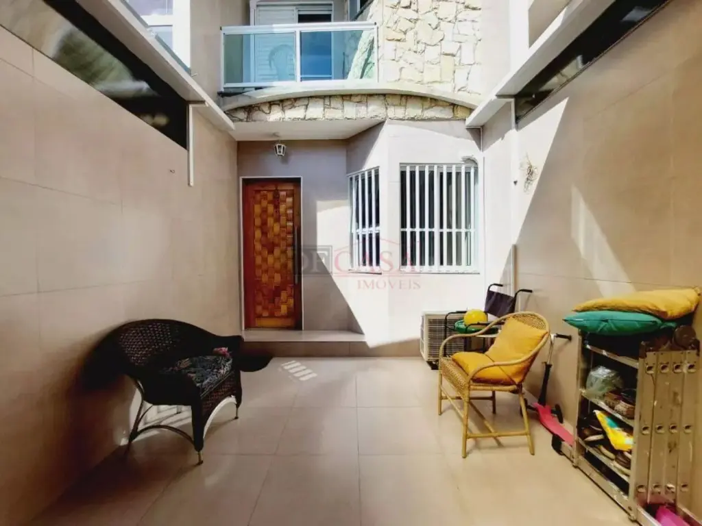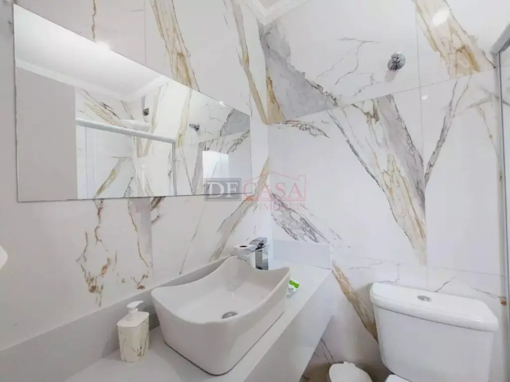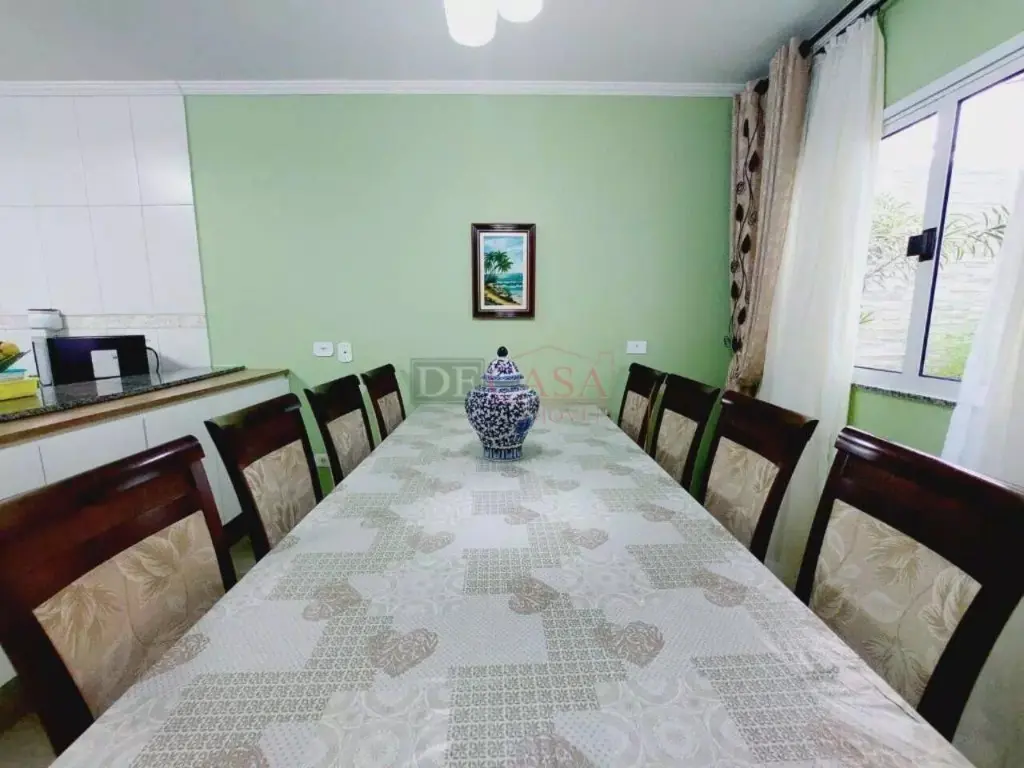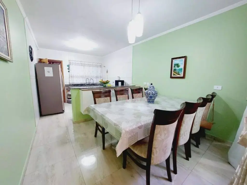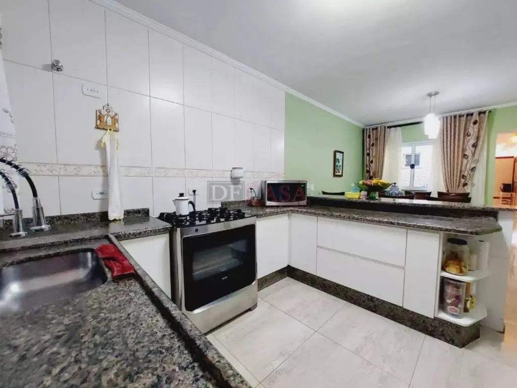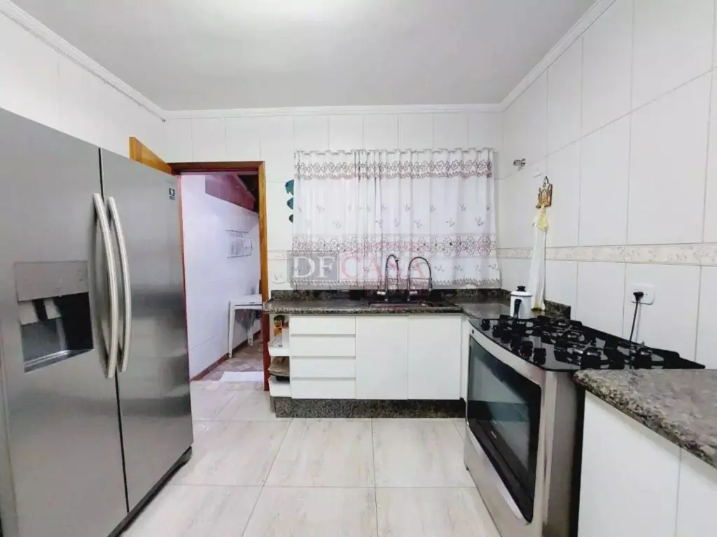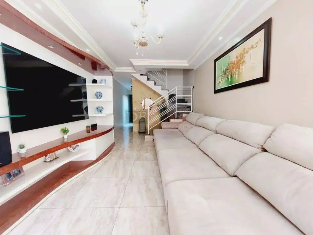 Sobrado com sala de estar com sanca de gesso e luminárias, sala de jantar, lavabo, cozinha com planejados, área de serviço coberta, quintal e churrasqueiro, 2 banheiros (1 lavabo), 3 dormitórios (1 suíte e sacada).
