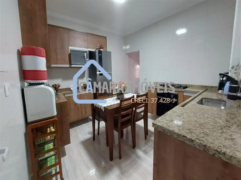 A cozinha é espaçosa e possui piso frio, além de contar com azulejos que vão até o teto. Também possui armários embutidos, que ajudam a otimizar o espaço e armazenar utensílios e mantimentos.