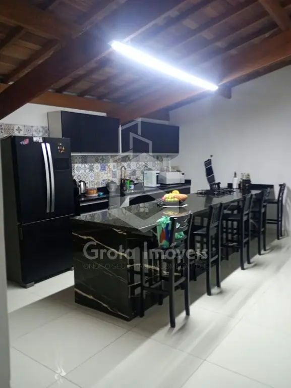 Ampla cozinha com bancada de 4 metros e pia com bancada de 3,40 metros com armários, 2 banheiros, lavanderia e corredor lateral.