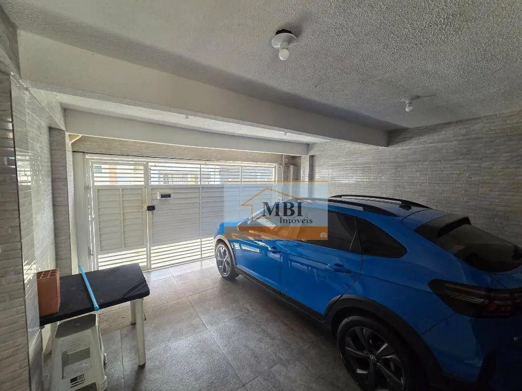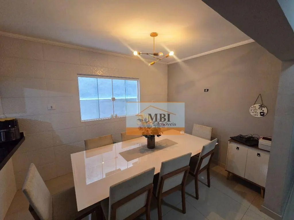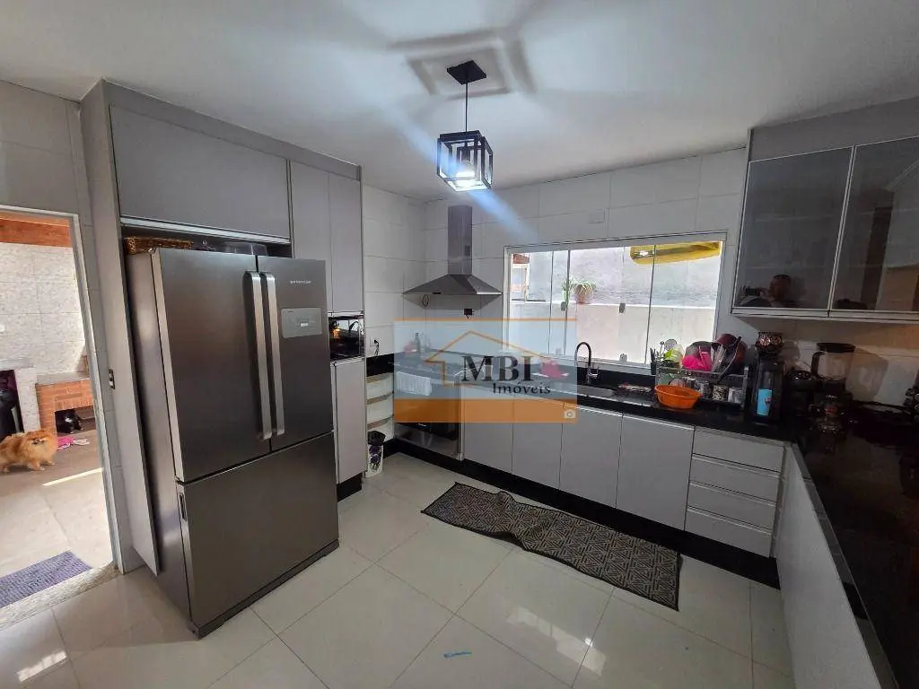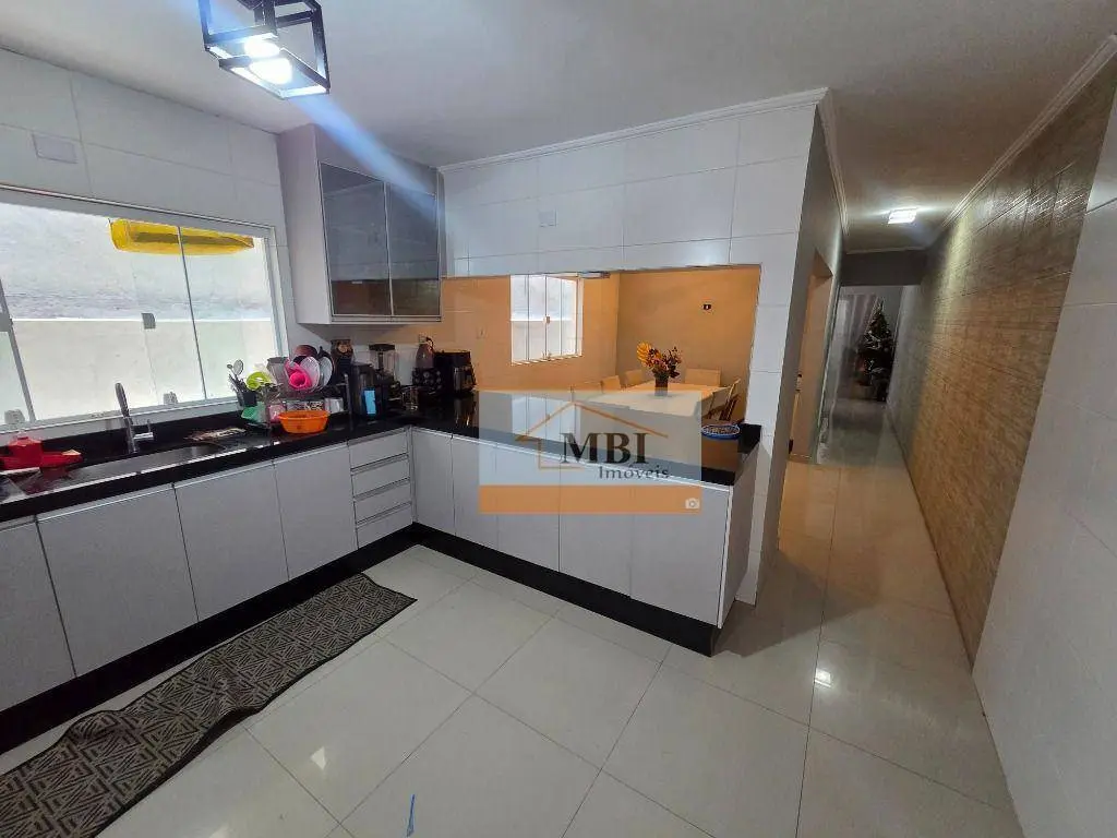 Sala ampla, 2 vagas de garagem coberta, copa e cozinha grande tudo com armários e no fundo área de serviço coberta com churrasqueira e forno.