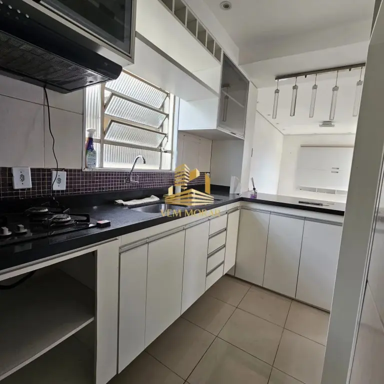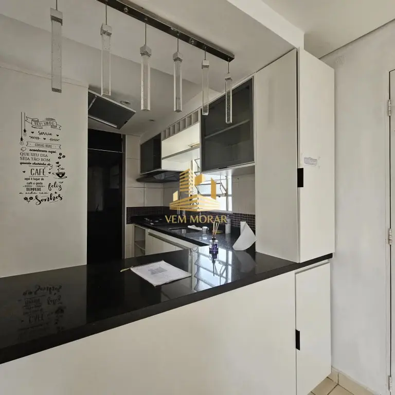 Cozinha com armário planejado, cooktop, coifa e lustre