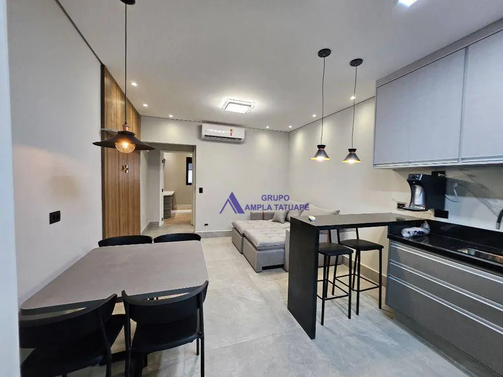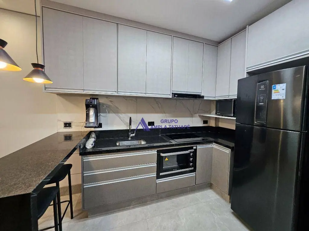 O imóvel possui ar condicionado na sala e no dormitório, com sistema inverter para maior eficiência energética. Totalmente mobiliado, com geladeira, forno, fogão elétrico, micro-ondas, filtro de água, máquina de lavar, painel de TV, sofá com chaise longue, cama box, bancada de escritório com painel e armários planejados em todo o imóvel. A iluminação em LED traz um toque moderno e aconchegante ao ambiente.