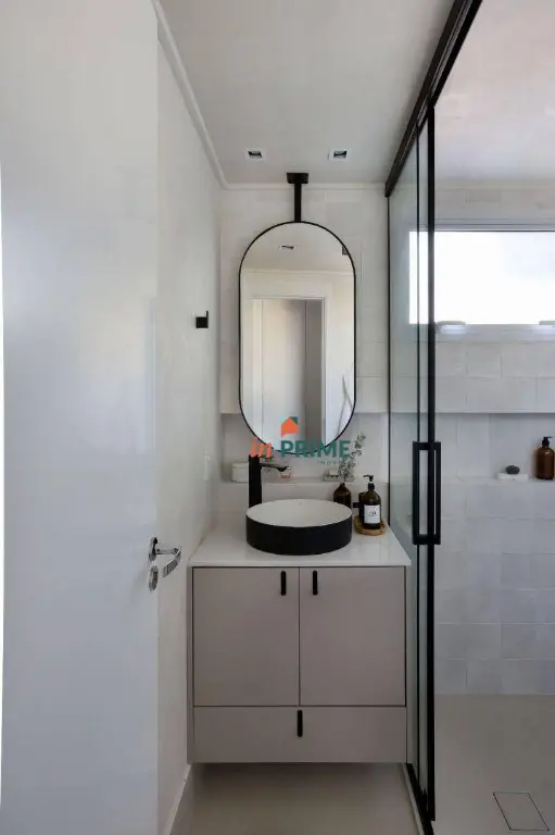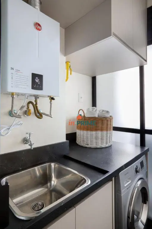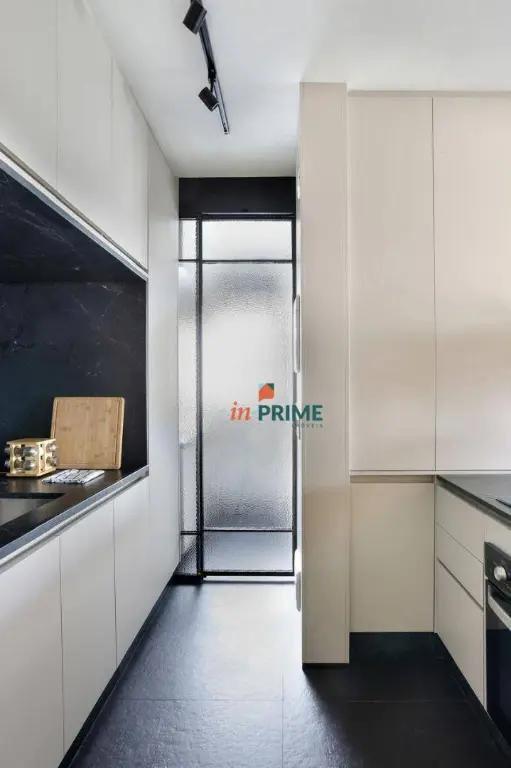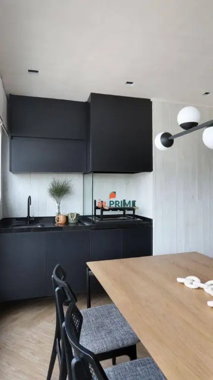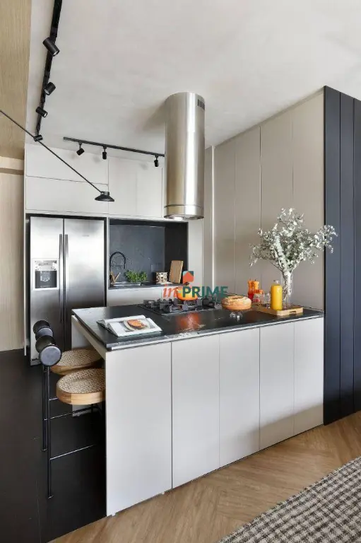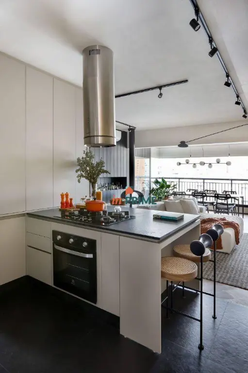 Piso vinílico em todo apartamento e porcelanato Portobello Shop na Cozinha, Área de serviço e Banheiro Suíte Master. Mármore Negresco na cozinha e área de serviço. Geladeira Electrolux side-by-side, Cooktop modelo Home Pro Electrolux, Forno elétrico Electrolux e coifa de teto.