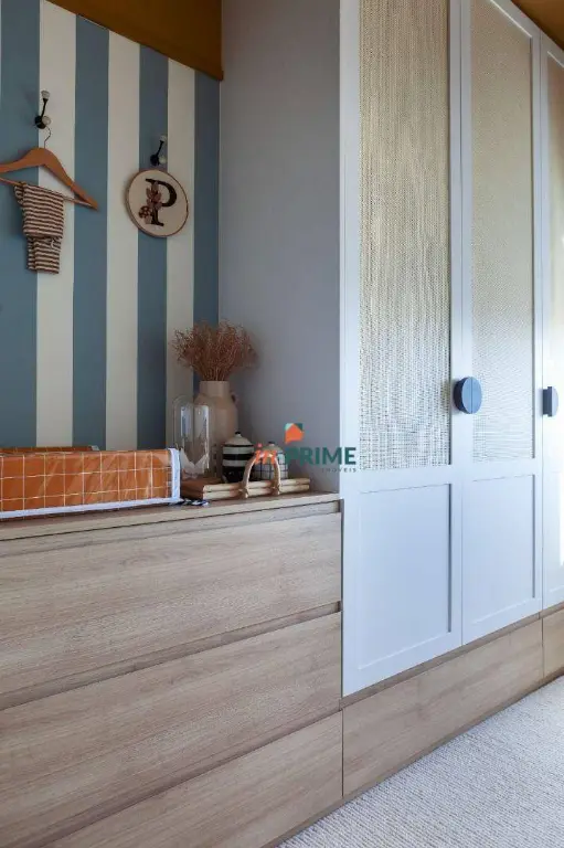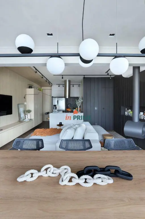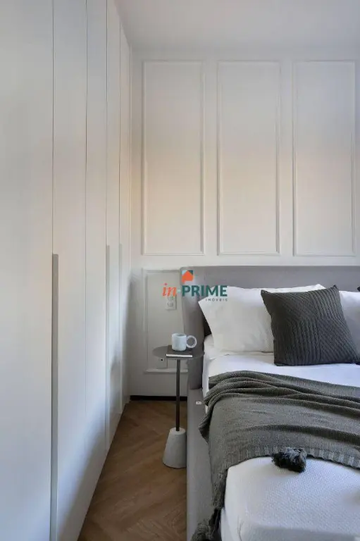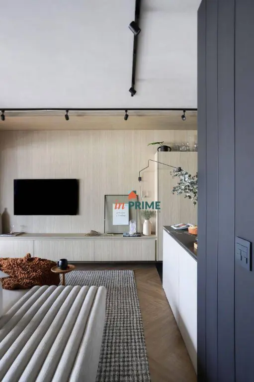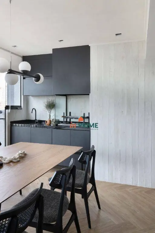 Apartamento de 85m2, com projeto de interiores elaborado pelo Studio TACCO, com armários planejados personalizados em todos os ambientes pela Todeschini. Sala com 2 ambientes, jantar e estar com lareira ecológica suspensa, painel laqueado ripado com portas mimetizadas e bar embutido.