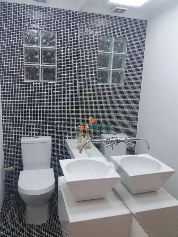 Lavabo e banheiros todos pastilhados.