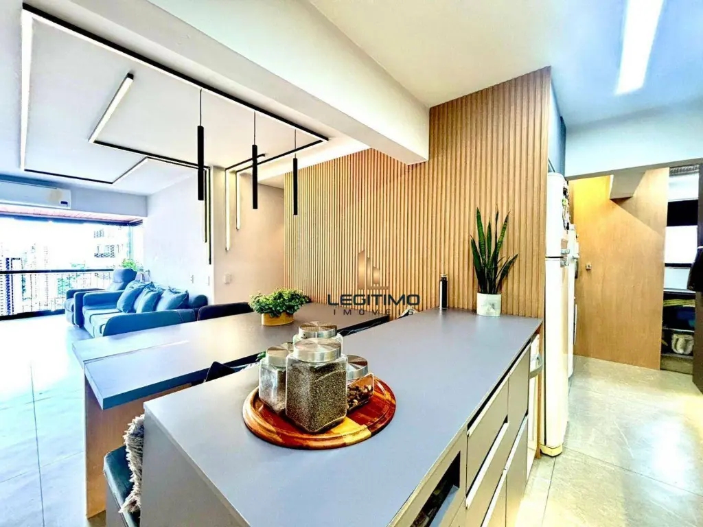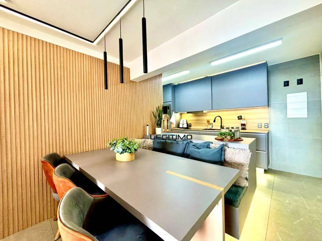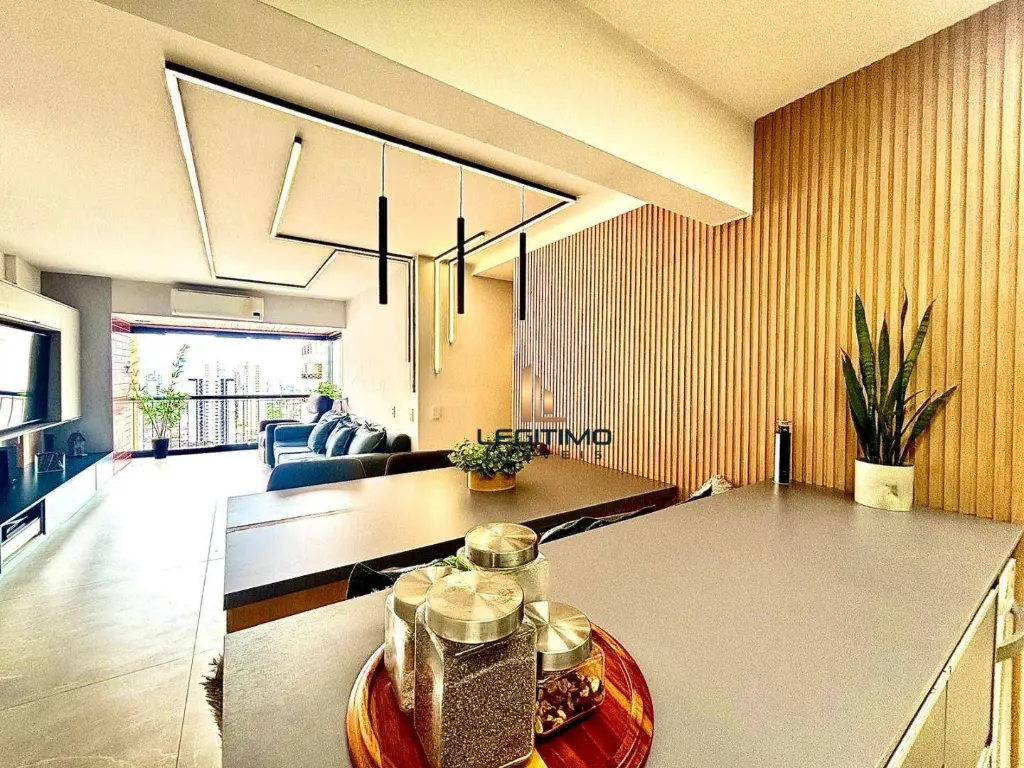 A sala ampla possui um lindo projeto de iluminação, sofá confortável, TV de 60 e mesa de jantar com cadeiras. A sacada é o espaço perfeito para relaxar e receber amigos.