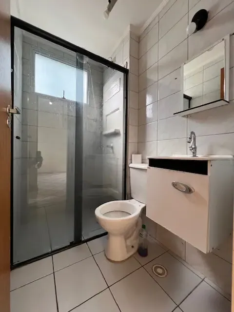 Armários planejados na cozinha e banheiro com box de vidro.