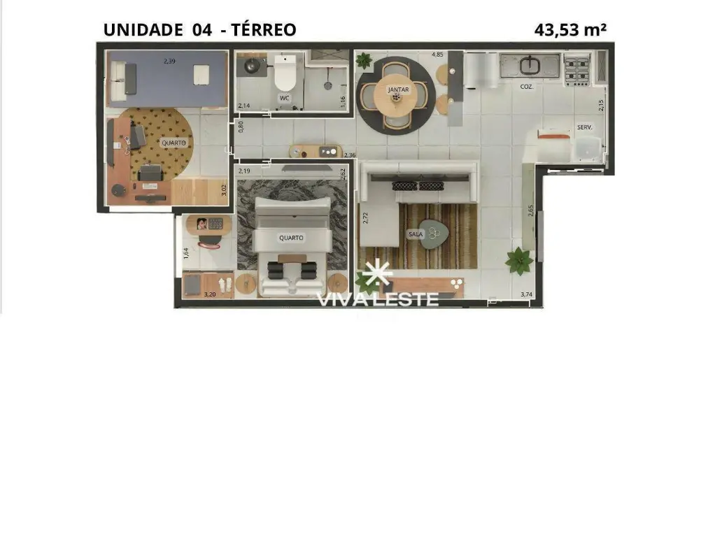 O imóvel conta com um dormitório bem iluminado, sala de estar aconchegante, cozinha integrada e banheiro social. A planta foi pensada para otimizar cada metro², proporcionando um ambiente moderno e fácil de manter, ideal para quem possui uma rotina dinâmica e não abre mão do conforto.