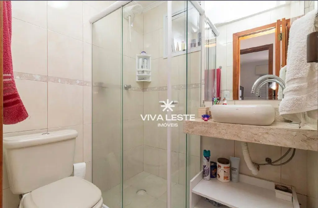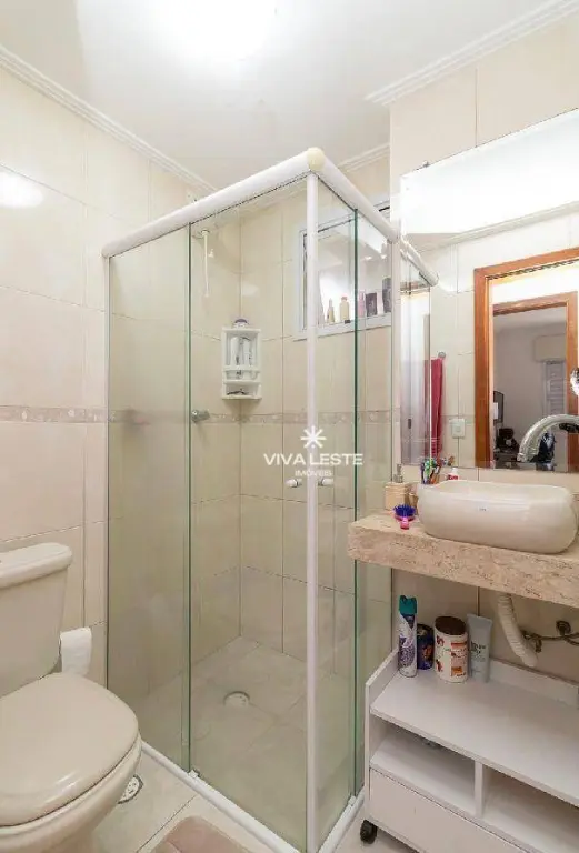 Banheiro com box, espelho e armário móvel