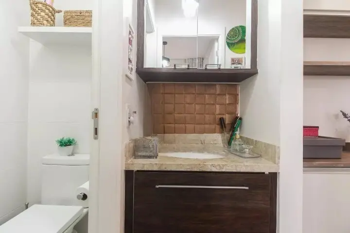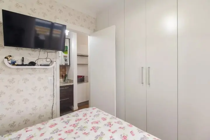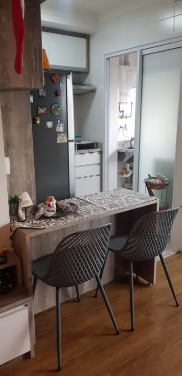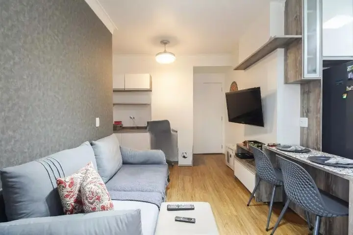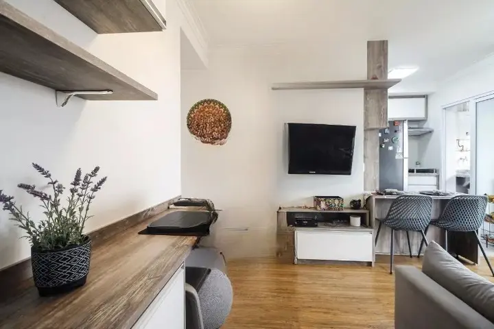 - Composição: 1 quarto, sala com 2 ambientes e varanda, cozinha com armários planejados, área de serviço e banheiro.