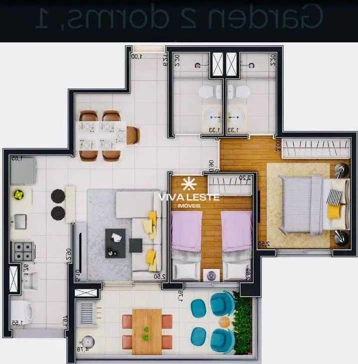 A unidade dispõe de uma planta bem distribuída, contando com 2 dormitórios, sendo 1 suíte aconchegante, e um banheiro social, totalizando 2 banheiros com ótimo padrão de revestimento. A área social é integrada, proporcionando amplitude e iluminação natural em todos os ambientes.