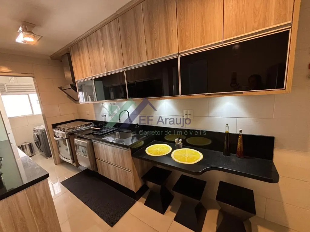 Ficara´ no apartamento: mo´veis planejados em 1 dormito´rio, cozinha, lavanderia, dispensa, banheiro sui´te e banheiro social, painel da sala, sofa´, mesa jantar com canto alema~o, cadeiras, foga~o embutido e coifa.