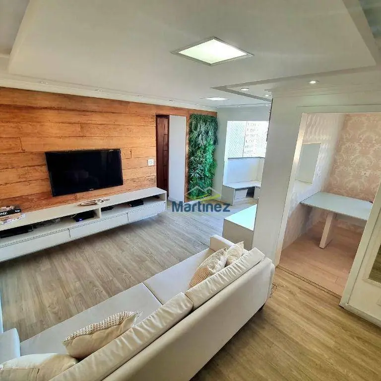 Sala Aconchegante: A sala de estar, com sacada integrada, apresenta painel de madeira maciça, jardim vertical e um canto alemão com gavetas, criando um ambiente acolhedor e sofisticado.