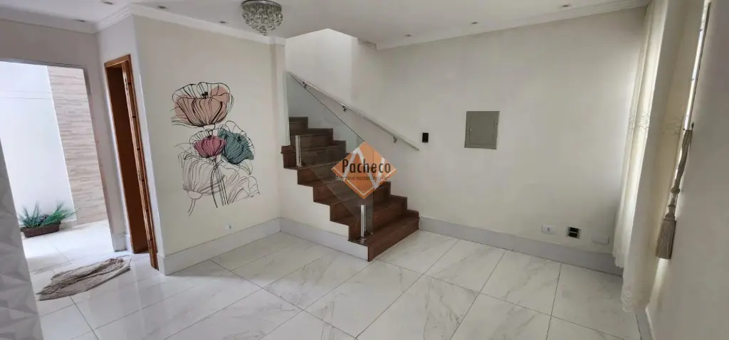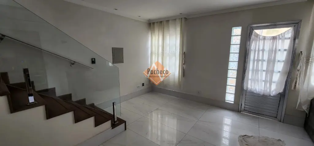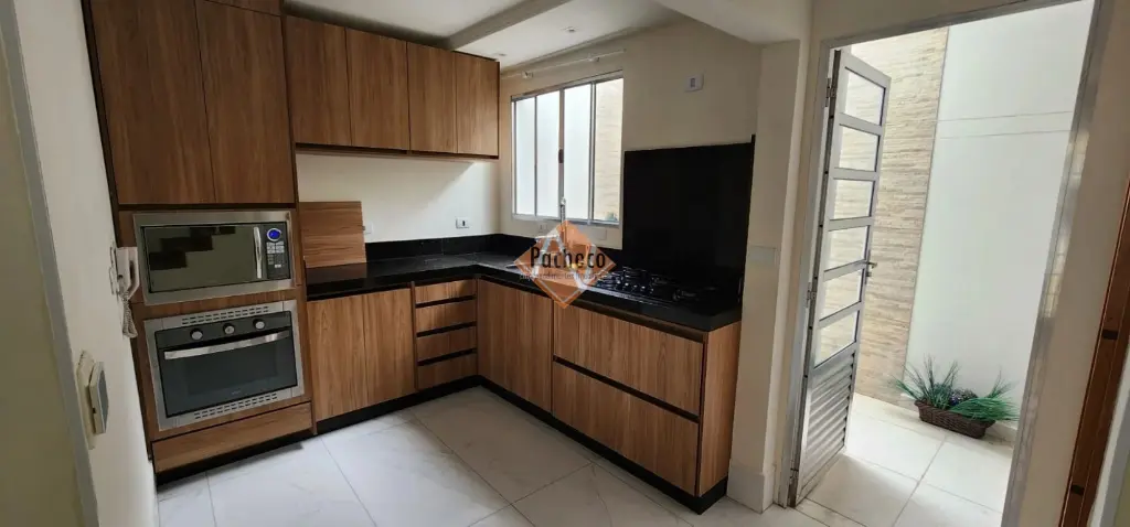 Sobrado em condomínio fechado com 02 dormitórios, sendo 01 com armários, varanda, sala ampla para dois ambientes com sofá e rack, cozinha planejada equipada com cooktop, micro-ondas e forno, banheiro com box, armário e espelho, lavabo, área de serviço coberta, 02 vagas de garagem cobertas e depósito.