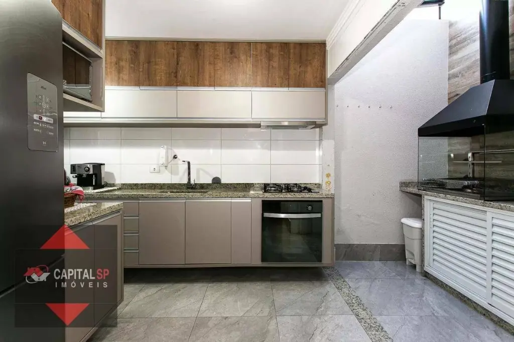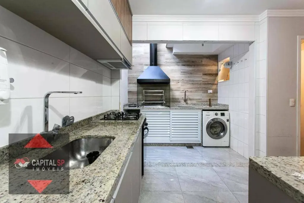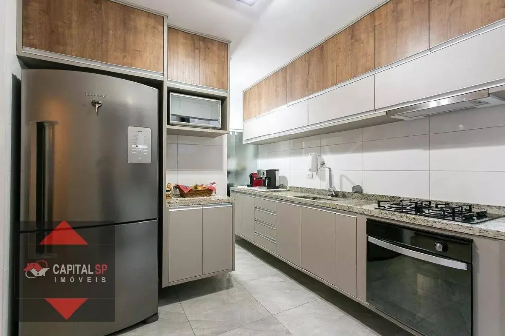 Cozinha planejada, equipada com móveis sob medida e acabamento em granito