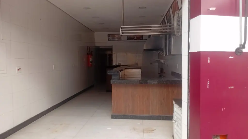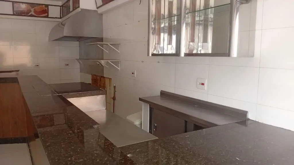 Espaço ventilado, com alguns equipamentos (pia, balcão pronto etc.).