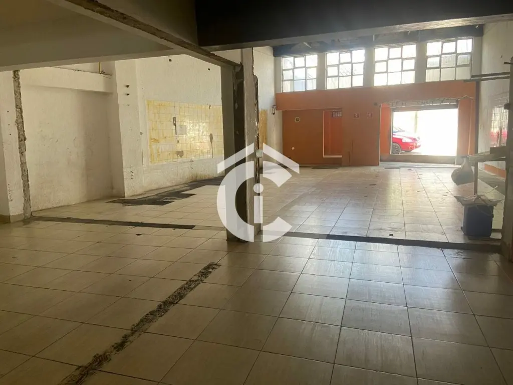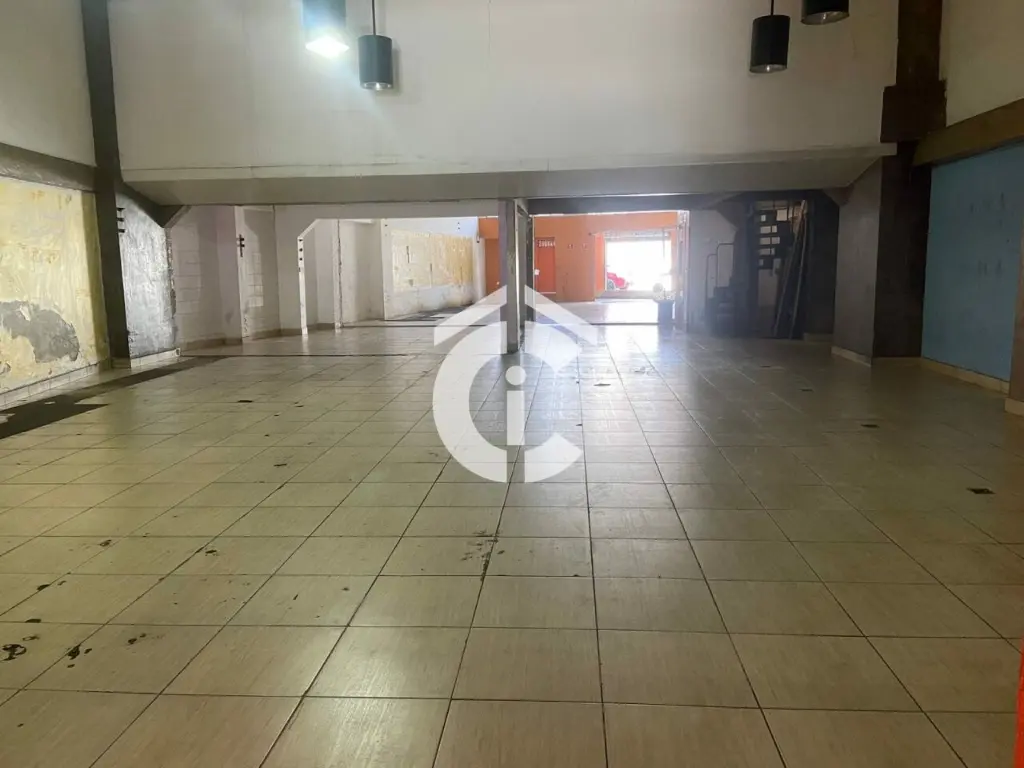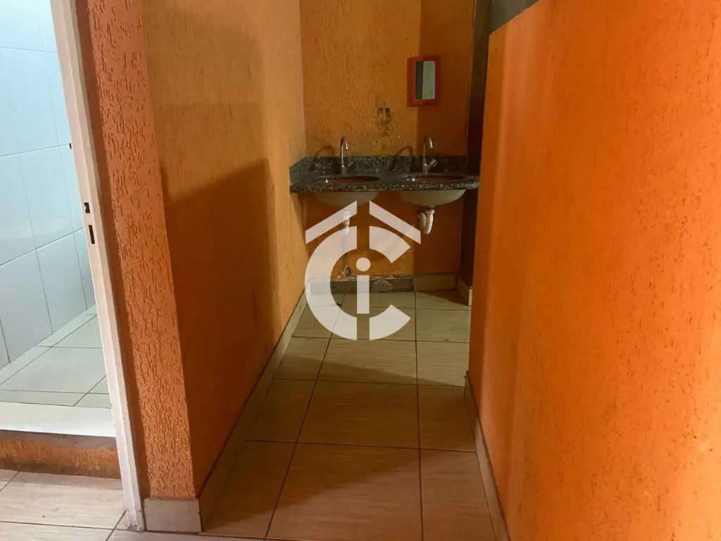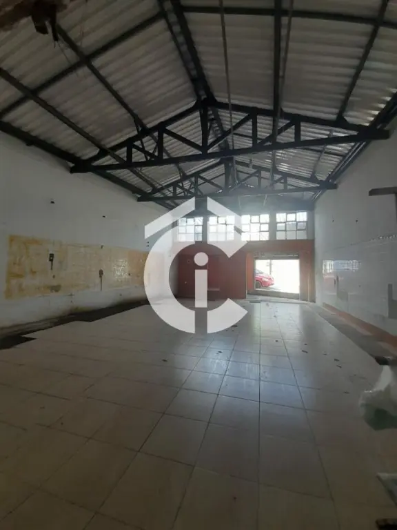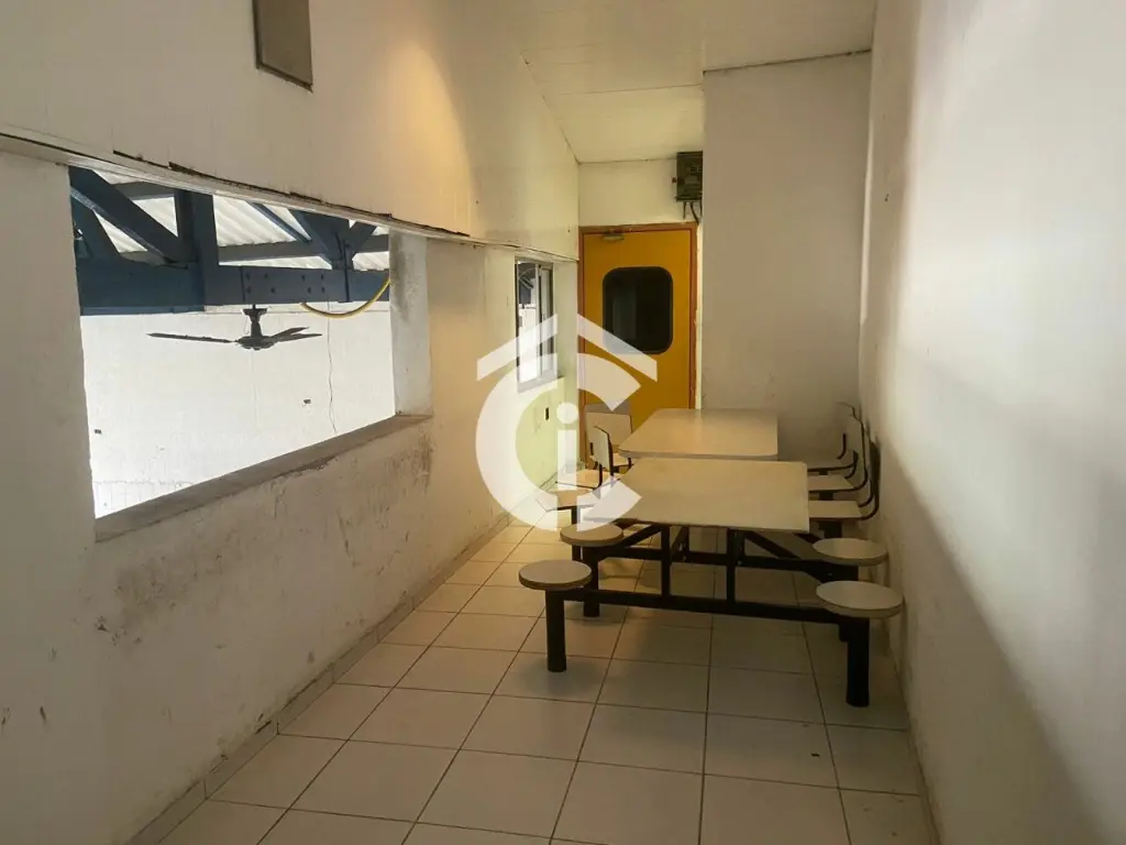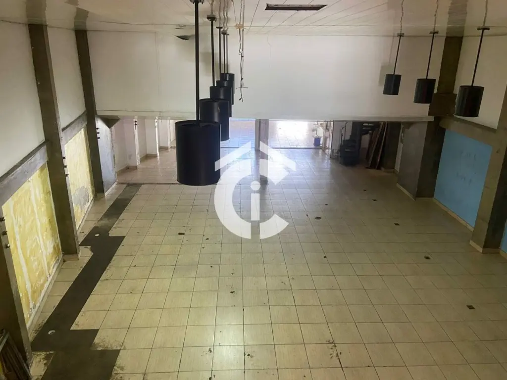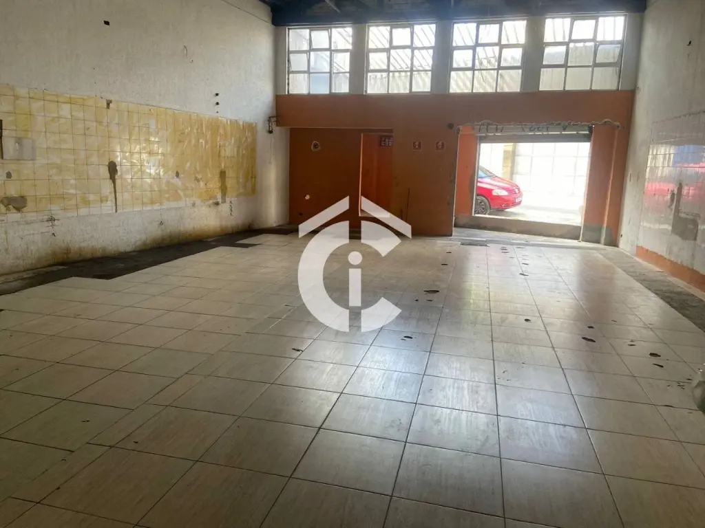 São 321 m² e mais mezanino totalizando 437 m². Possui escritórios, banheiros, vestiário e cozinha. Porta de aço, 2 entradas.