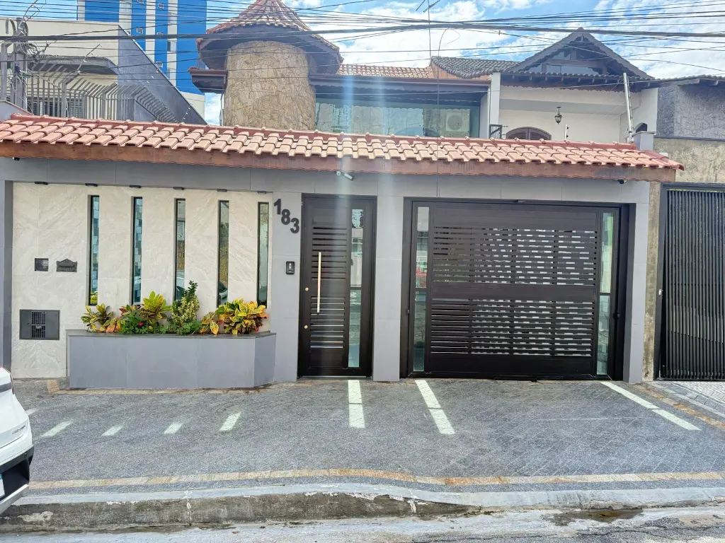 Térreo: garagem para 5 carros, 01 quarto de empregada amplo, 2 quartos de ferramentas, 01 banheiro social, escritório duplo, varanda toda em pastilha e balaústres, churrasqueira com quiosque, piscina nova toda em alvenaria de 50.000 lts, cascata em inox com Led acoplado, cerca elétrica, iluminação nos muros, iluminação central.