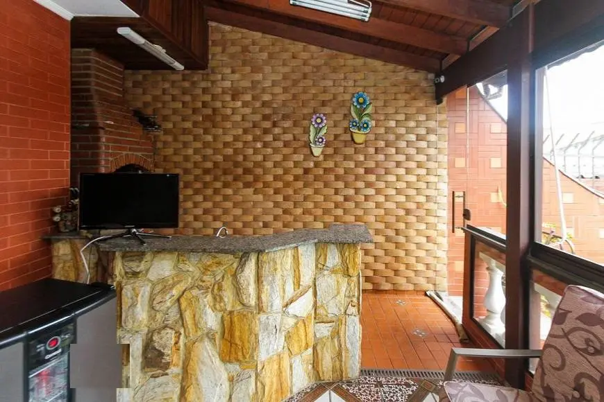 Paredes com pastilha cor cerâmica, frente em pedra madeira, 2 portões automáticos, sistema de alarme com comunicação via celular e telefone com monitoramento, 7 câmeras com sistema de stand alone para 8 câmeras, piscina em alvenaria nova e com capa, aquecedor elétrico central para banheiros e cozinha, aquecedor de piscina