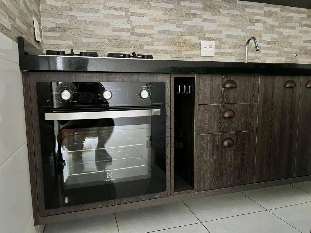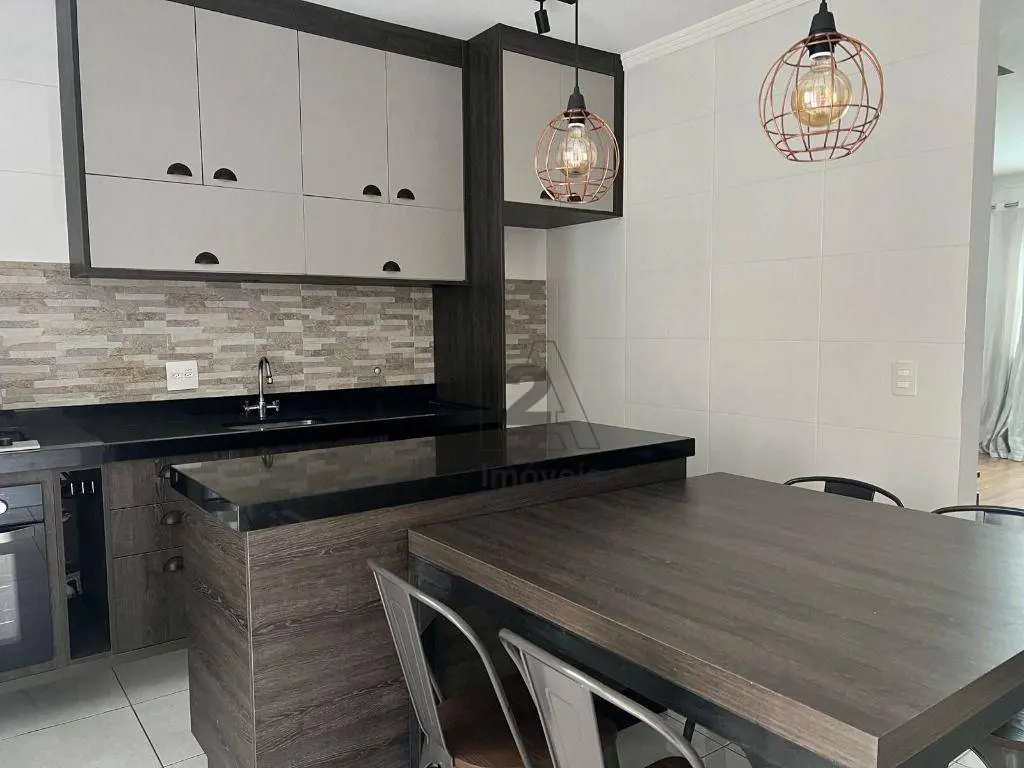 Cozinha planejada, equipada com armários, mesa, cadeiras, forno e cooktop