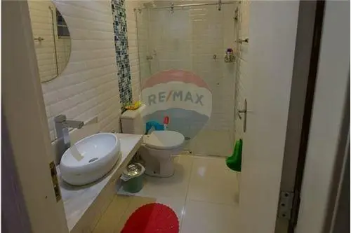 Banheiro social com bancada em granito e cuba de sobrepor em louça branca, box em vidro temperado, revestimento cerâmico, teto rebaixado com iluminação embutida.