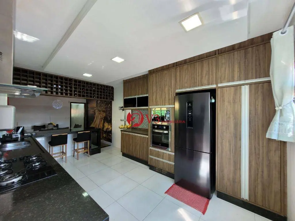 Cozinha em L completa com enorme balcão de granito, iluminação natural toda planejada